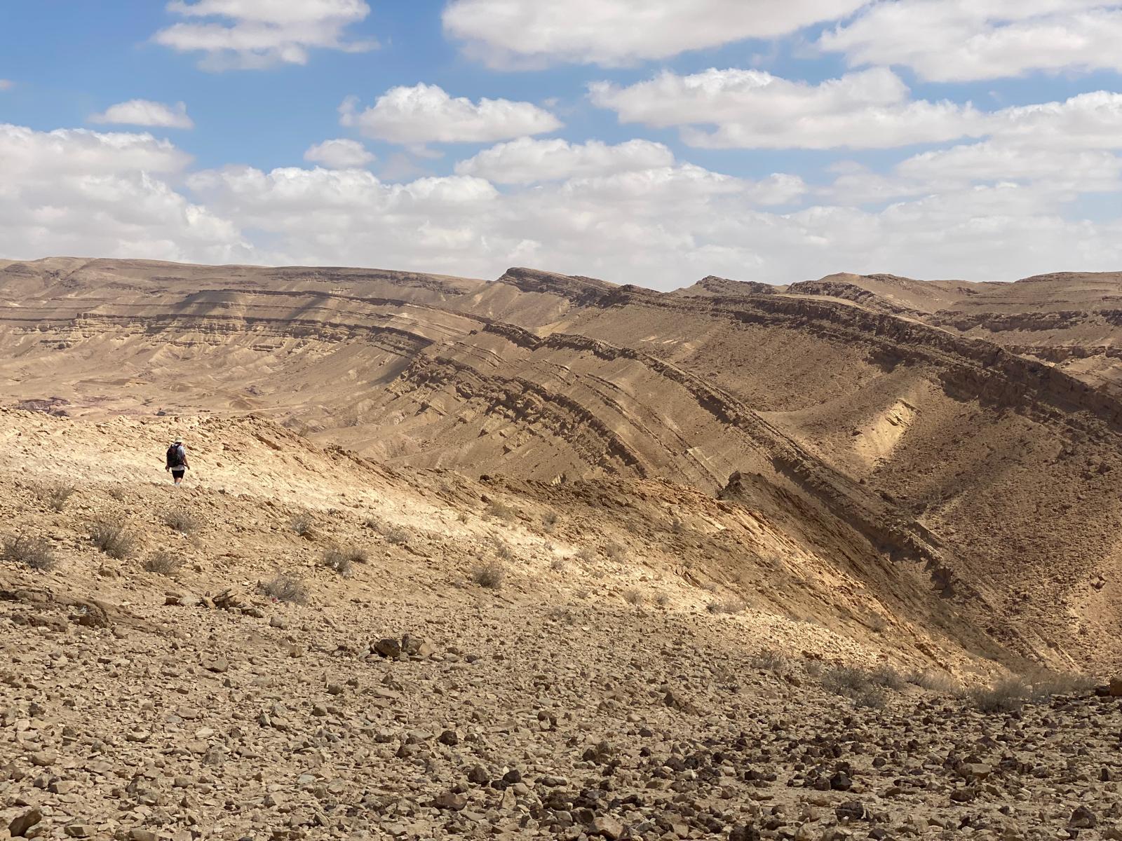 Because of the shifting of the layers due to the rift, and the collapse of the upper crust of the area, fins of rock are seen on the eastern edges of the makhtesh. One of these gives its name to a hiking trail “The Big Fin” along this formation, with beautiful vistas. I hiked a similar trail, “The Small Fin” recently with my grandchildren and we got to discover this “only in Israel” phenomenon for ourselves.